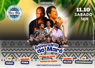 São 5 anos de inúmeros sambas, mesas cheias de amigos, petisquinhos gostosos e aquela cerva trincando! E no dia 11 de outubro, celebrarão junto com todos vocês, com muita alegria e música boa mais um ano de Maré Alta! Samba de Maré convida, o trio Bucha de Terno, e ainda Beleza Pura, Samba de Aye e os DJs Orixafricano e Carol. Vai ser lindo!Praia do Pontal - 16h