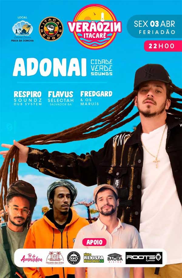 Adonai | Cidade Verde Sounds. Diretamente de SP mais de 10 anos de hits, energia lá em cima e aquela vibe que só quem já viveu sabe… Cabana Corais – Praia da Concha, 03 de Abril, 22h. Fredgard & Os Maruís (banda ao vivo abrindo a noite). Respiro Soundz, Flavus Selectah.