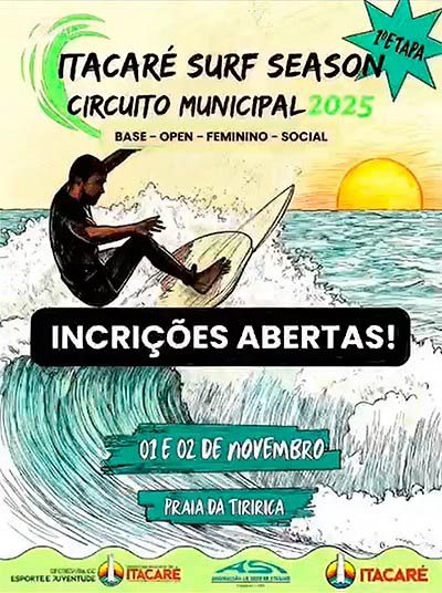 O Circuito Municipal de Surf de Itacaré chega com tudo pra fortalecer o surf de base, revelar novos talentos e celebrar o esporte que move nossa cidade! Dias  1 e 2 de novembro, na Praia da Tiririca!