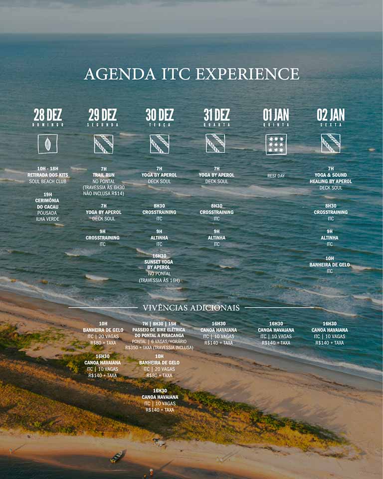 Dia: beach club, esportes e uma programação completa de bem-estar. Noite: festas open bar, bandas, DJs e encontros que só acontecem aqui. Compre através do link!