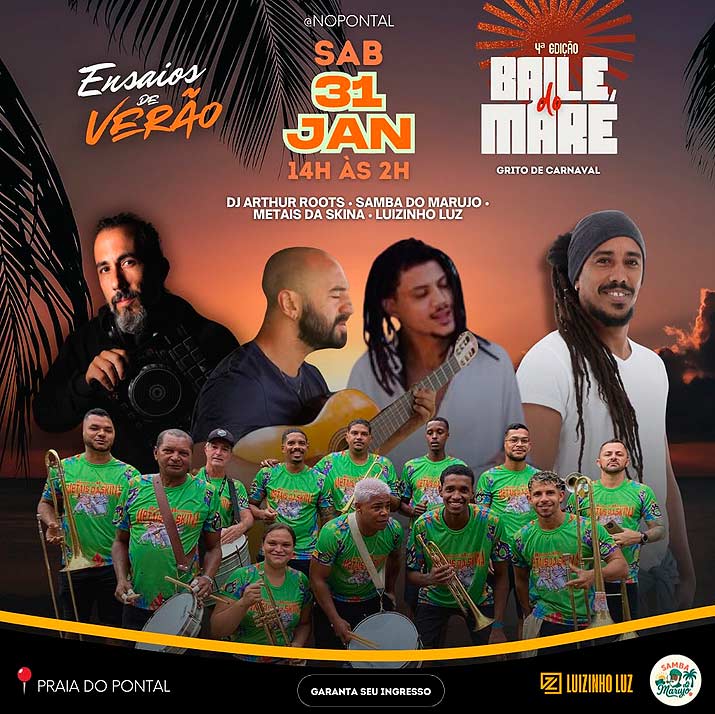 Prontos para uma edição com a cara da melhor estação? Praia, sol, altinha, alegria, aquele pôr do sol espetacular, música boa e a vibe lá em cima! A programação: Samba do Marujo, Metais da Skina, Luizinho Luz (axé) e você! Aquele puro suco de Brasil que a gente ama. O evento começa cedo! É para ir de biquíni, levar a bola, a canga, o frescobol e o glitter! Vem curtir os ensaios de verão!
