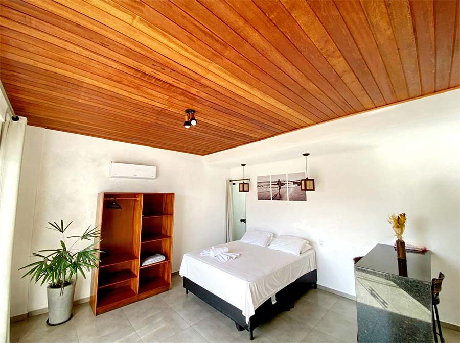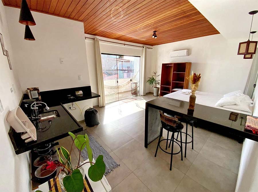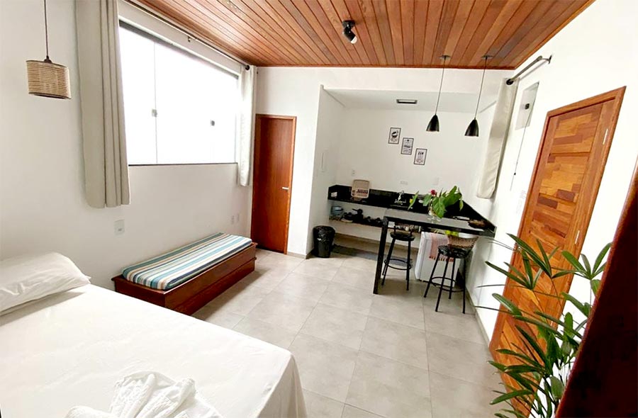 Acomodações confortáveis. Lofts completos para 2 pessoas com cozinha integrada, ar-condicionado, frigobar e cama de casal.