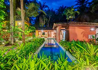 House retreat conveniently located in the tropical forest yet within the confinement of the village. 3 suites with air conditioner or ceiling fans. Beds for 9 persons. Private balconies and bathrooms in each of the suites. Chef’s kitchen with indoor/outdoor bar and center island. Spacious garden with deck and swimming pool. Wi-Fi.TV. Safe deposit box. Bbq. Private parking.Rua Amendoeira - Concha