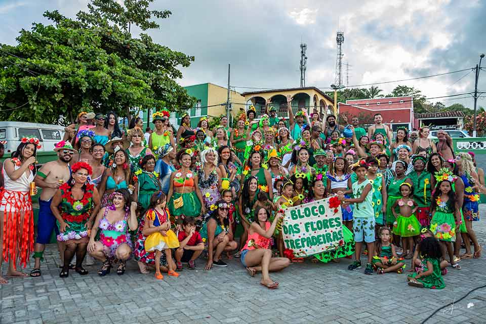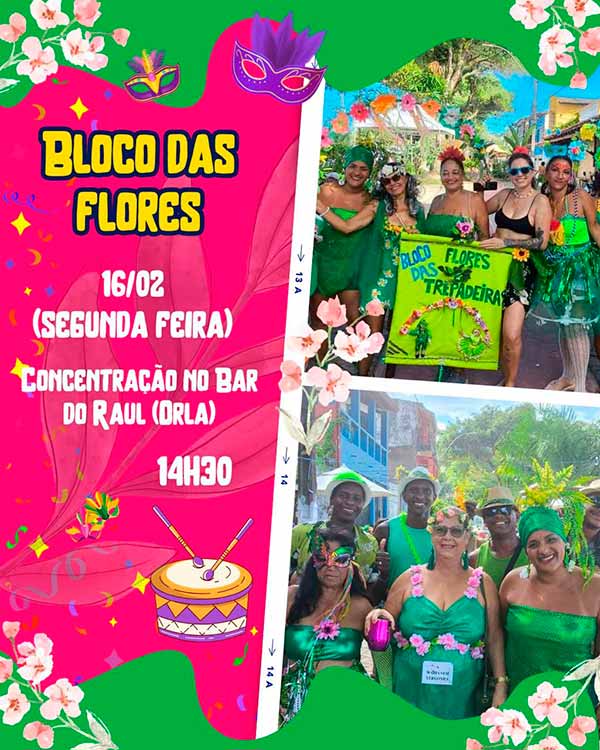 Bloco das Flores é um bloco tradicional de Itacaré, totalmente gratuito e sem fins lucrativos. Sai na segunda-feira, 16/02, com concentração no Bar do Raul (orla) a partir das 15h levando muitas cores, flores e alegria para o Carnaval de Itacaré! Vá de verde!