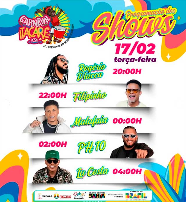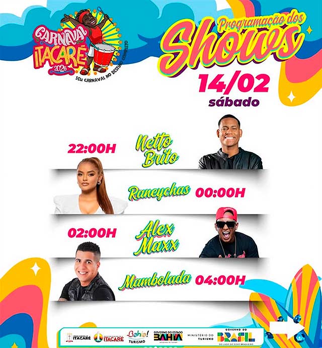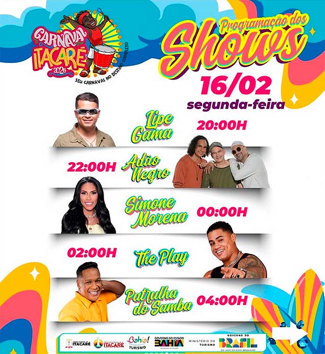 De 11 a 18/02 Itacaré é palco de muita alegria, cultura e tradição, com uma programação que reúne blocos, além de shows ao vivo na orla, garantindo diversão para todos. Atrações como Adão Negro, Lipe Gama, Patrulha do Samba, Larissa Gomes, Alex Maxx, Xella, Guga Meyra, Malafaia, Boteco das Amigas, Simone Morena, Netto Brito, Toque Dez, Cia do Kaprixxo, Vina Calmon e muito mais são esperadas!