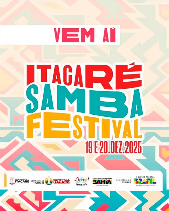 Salve o samba, salve Itacaré! Nos dias 19 e 20 de dezembro, a cidade vai vibrar no ritmo da alegria com o Itacaré Samba Festival! Prepare o coração, o gingado e venha celebrar a nossa cultura, nossas raízes e o som que embala gerações. Reserve essa data!