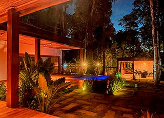House retreat conveniently located in the tropical forest yet within the confinement of the village. 3 suites with air conditioner or ceiling fans. Beds for 9 persons. Private balconies and bathrooms in each of the suites. Chef’s kitchen with indoor/outdoor bar and center island. Spacious garden with deck and swimming pool. Wi-Fi.TV. Safe deposit box. Bbq. Private parking.Rua Amendoeira - Concha