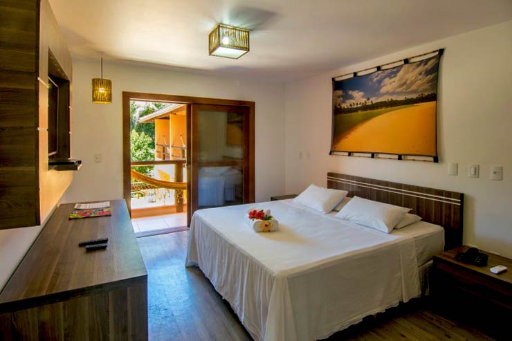 Suítes confortáveis com TV por assinatura, ar-condicionado, frigobar, varanda com rede e cofre. Ambiente agradável e muito verde. Duas piscinas, sendo uma com raia semi-olímpica.